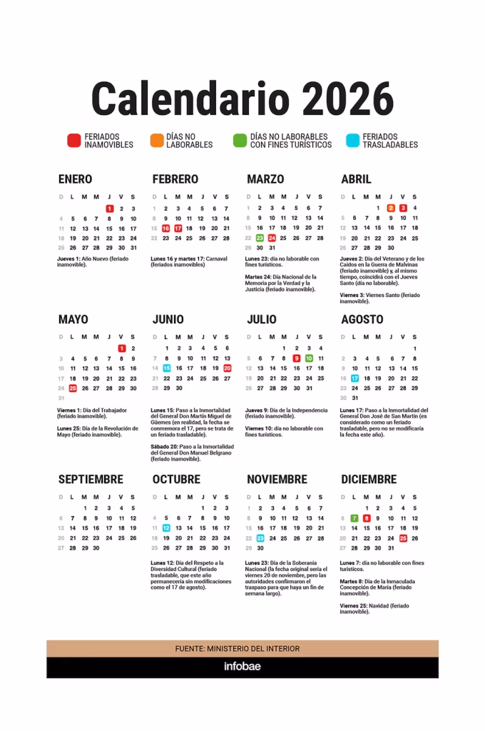Para este 2026 se espera casi un fin de semana largo por mes, luego del decreto de hoy del Gobierno nacional para formalizar la incorporación de tres nuevos feriados no laborables con fines turísticos, destinados a extender los fines de semana y dinamizar el turismo interno.