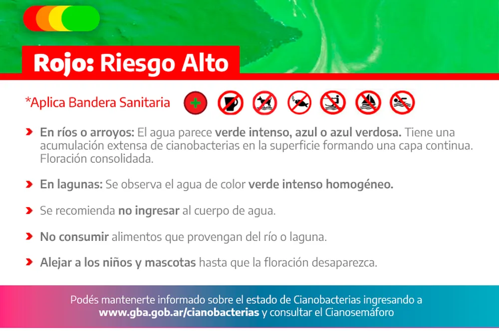 Con la bandera “roja”, las lagunas aparecen con un color verde intenso homogéneo, y las autoridades recomiendan que la gente no ingrese. Tampoco se deben consumir alimentos que provengan de la laguna, como los peces, y hay que alejar a niños y mascotas hasta que la floración desaparezca.