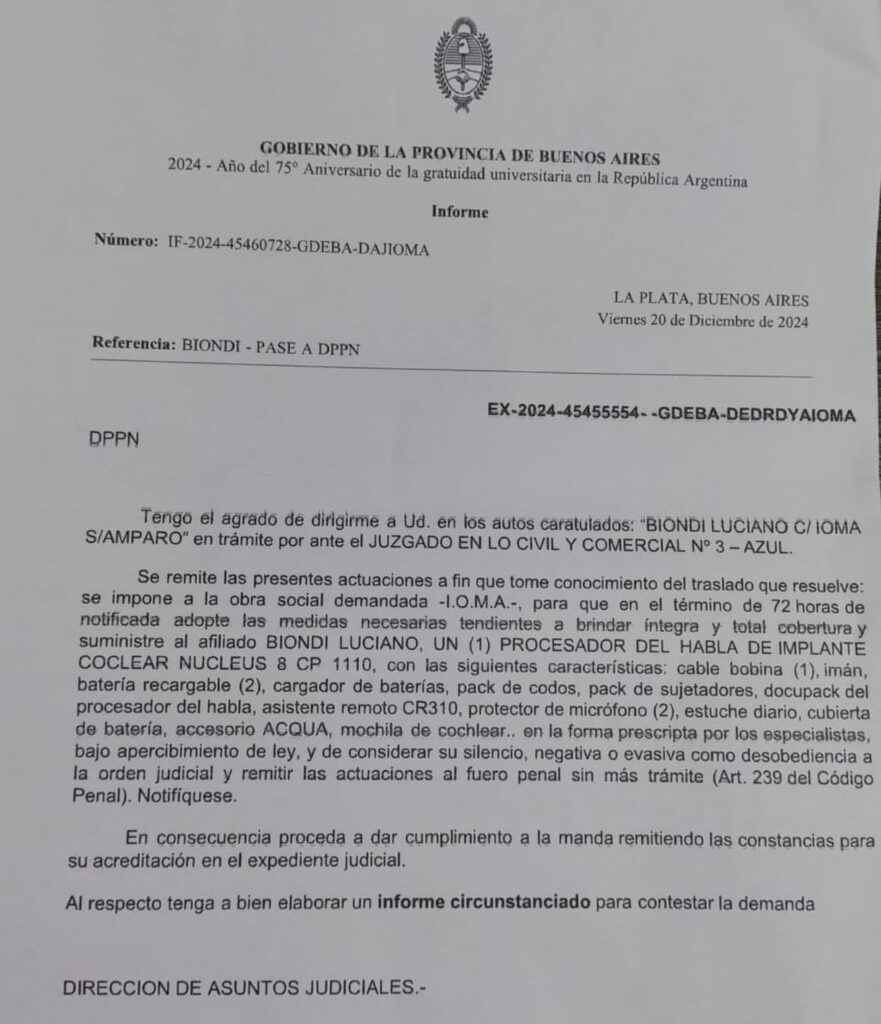 Una familia hizo público un desesperado pedido de ayuda para visibilizar la situación de Luciano Biondi, un joven rauchense que necesita con urgencia el reemplazo del procesador de su implante coclear, sin el cual hoy no puede escuchar, mientras la obra social IOMA continúa sin cumplir con una orden judicial que establece la cobertura total del dispositivo.