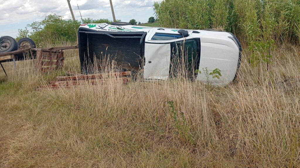Por causas que se tratan de establecer, una camioneta Ford Ranger que circulaba con un acoplado cargado con palos protagonizó un vuelco, quedando el vehículo y parte de la carga sobre la banquina.