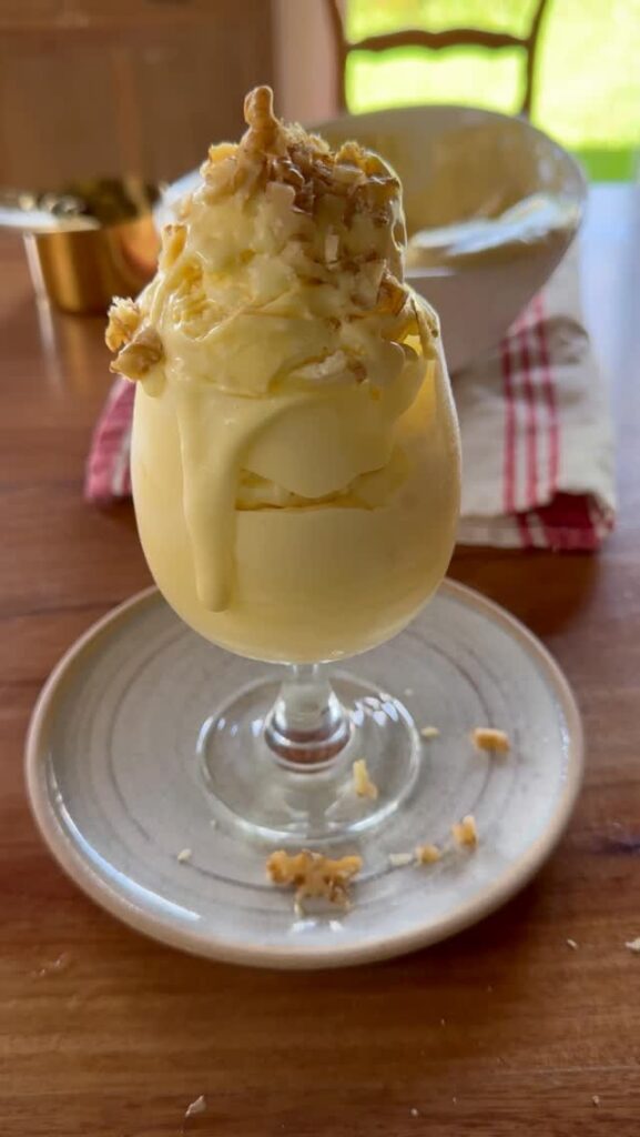 Una vez lista, la crema se coloca en un contenedor y se lleva al freezer por al menos tres horas para obtener un helado cremoso. Como alternativa, también puede refrigerarse durante cinco horas y servirse como una delicada mousse de sambayón.
