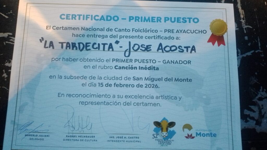 El artista local José Nieves Acosta obtuvo el primer puesto en el Certamen Nacional de Canto Folclórico – Pre Ayacucho, disputado en la ciudad de San Miguel del Monte, en el rubro Canción Inédita.