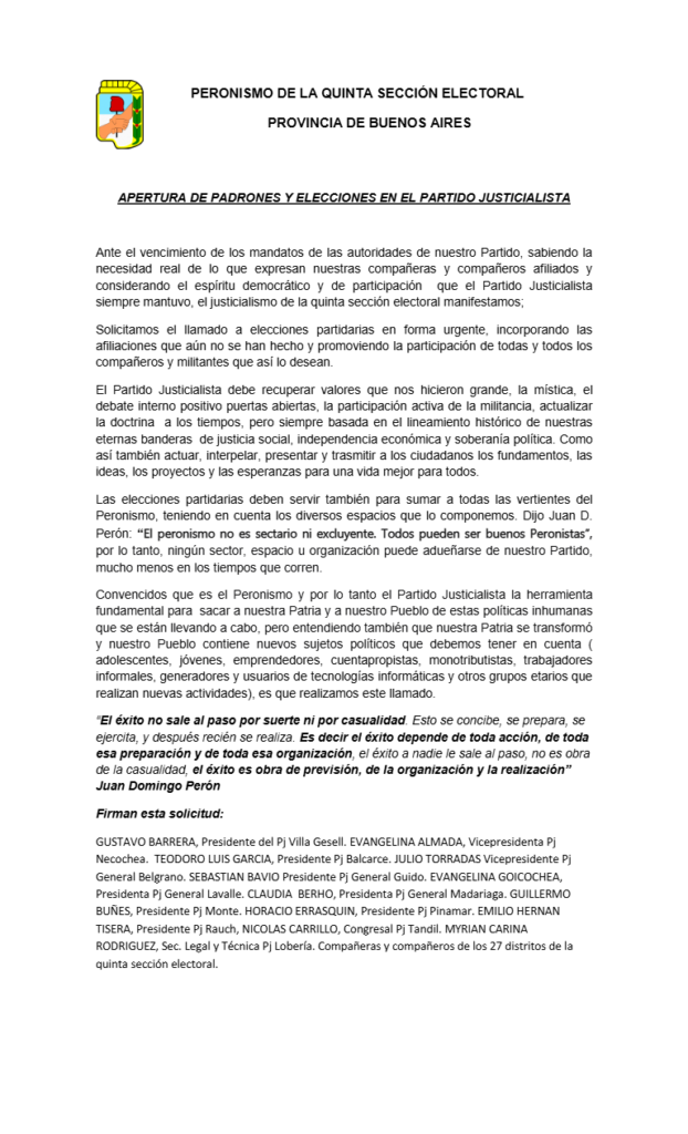 “El pedido surge de la necesidad real que expresan nuestras compañeras y compañeros afiliados, y del espíritu democrático y participativo que el Partido Justicialista siempre mantuvo”, señala el documento, que además remarca la necesidad de recuperar valores históricos como la mística, el debate interno, las puertas abiertas y la participación activa de la militancia.