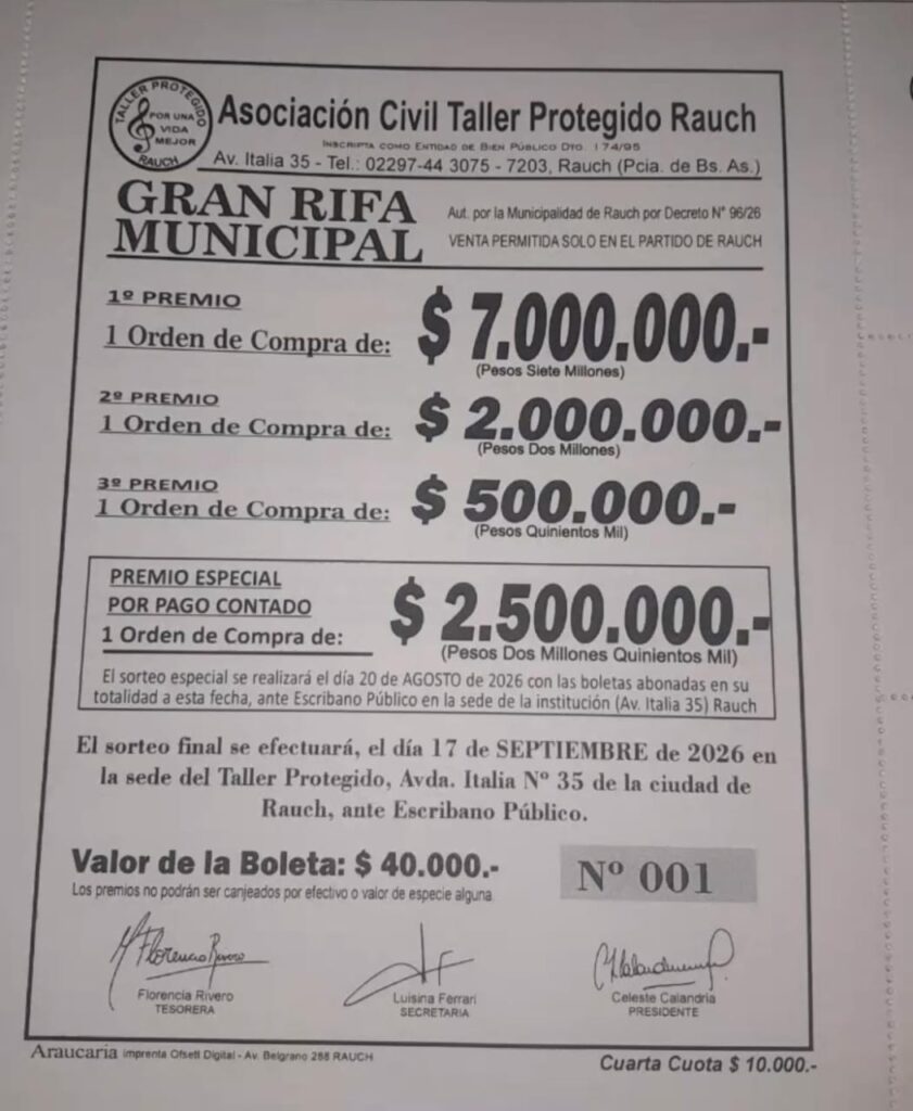 La rifa, autorizada por la Municipalidad de Rauch mediante el Decreto N° 96/26, cuenta este año con premios importantes en órdenes de compra. El primer premio será de 7.000.000 de pesos, el segundo de 2.000.000 de pesos y el tercero de 500.000 pesos. Además, se estableció un premio especial por pago contado de 2.500.000 pesos.