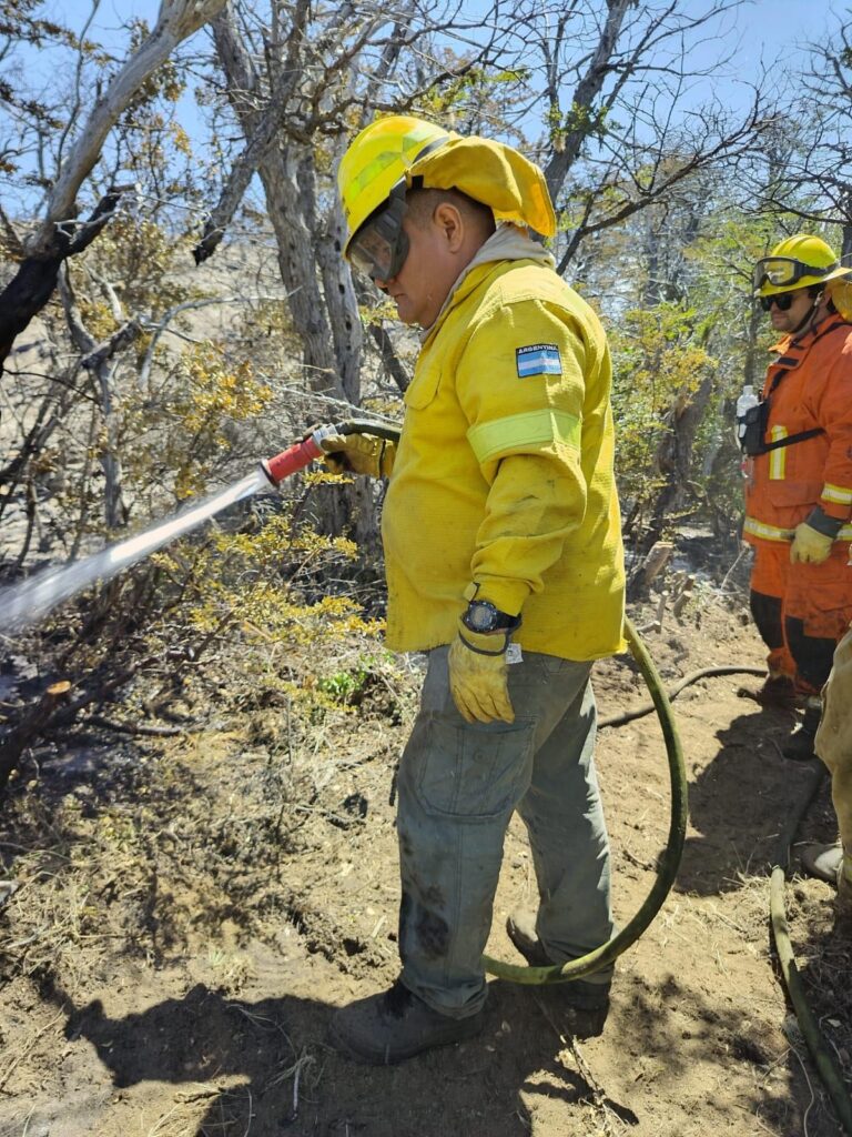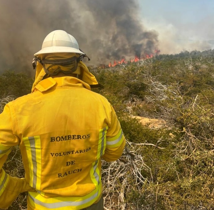 Entre los brigadistas desplegados en la zona se encuentra Oscar Vázquez, integrante del cuerpo de Bomberos Voluntarios de Rauch, especializado en incendios forestales, quien forma parte del equipo que trabaja intensamente en el frente de combate del fuego.