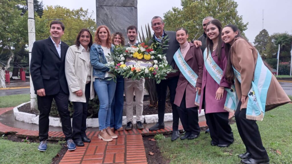 Tras el acto, el jefe comunal, acompañado por el titular del Concejo Deliberante, Jorge Barrena Faccio, el presidente del Consejo Escolar, Ezequiel Faccio, por las soberanas de la Fiesta Nacional del Ave de Raza, Matilda Belmartino, Milagros Vaqueiro y Agustina Morales, el integrante de la cooperadora Nicolás Sandoval, la directora de la institución Mariana Braun, la docente Luján Vázquez y la inspectora de nivel primario Liliana Urbina, colocó la ofrenda floral al pie del Monumento al Centenario.