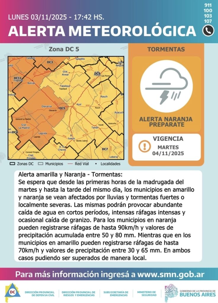 El Servicio Meteorológico Nacional (SMN) emitió una alerta naranja por tormentas para Rauch y otras localidades de la región centro de la provincia de Buenos Aires. La advertencia estará vigente desde la madrugada hasta la tarde de este martes, anticiparon desde el organismo nacional.