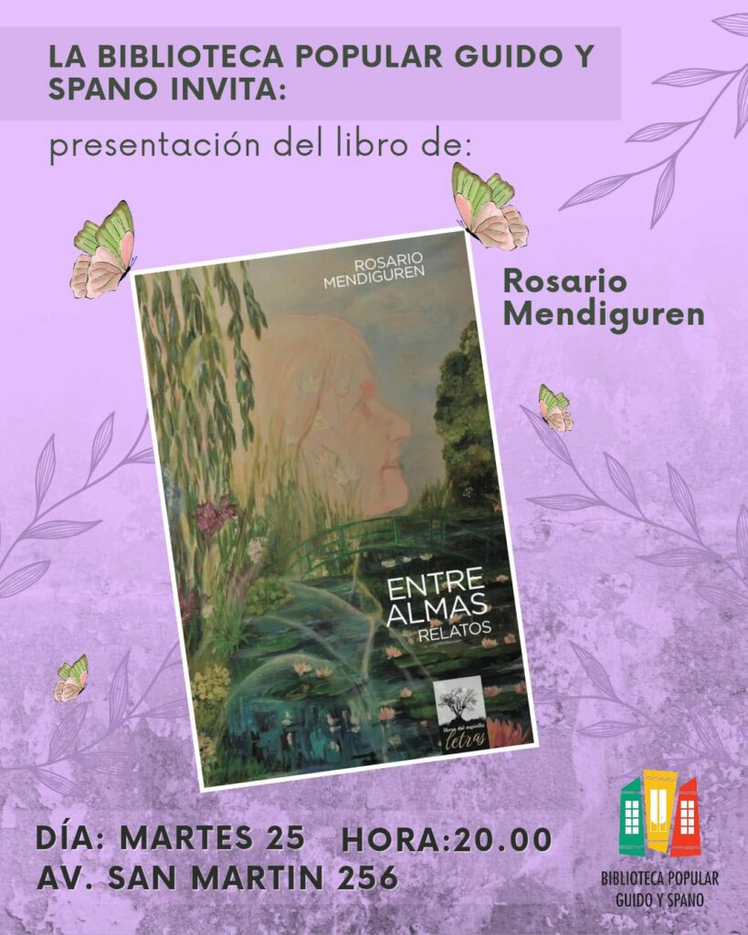 La escritora Rosario Mendiguren presentará en Rauch su último libro titulado “Entre almas. Relatos”. El encuentro literario se realizará este martes 25 de noviembre a las 20 horas en el Salón de Actos “Pedro Horacio Petreigne” de la Biblioteca Popular, en avenida San Martín 256.