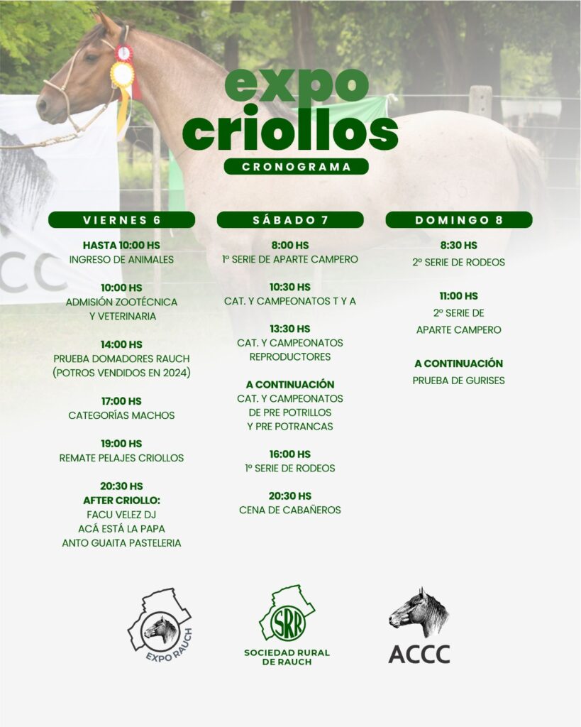 El cronograma comenzará este viernes con el ingreso de animales durante la mañana y la admisión zootécnica y veterinaria. Por la tarde se realizará la prueba de domadores de Rauch con potros vendidos en 2024, seguida por las categorías de machos y el remate de pelajes criollos. La jornada cerrará con un “After Criollo”, que incluirá música y propuestas gastronómicas.