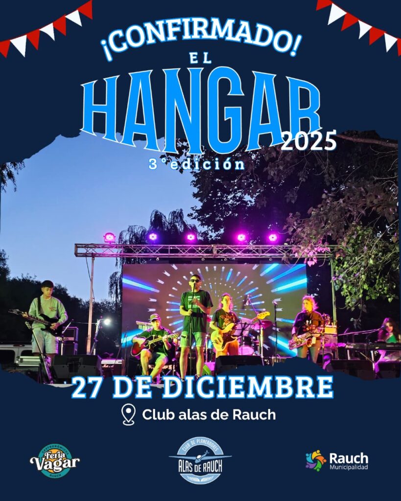 El próximo 27 de diciembre, el Club de Planeadores Alas de Rauch será nuevamente el escenario de la tercera edición de “El Hangar”, un evento gratuito que ya se instaló como una de las propuestas recreativas y culturales destacadas de la ciudad. La iniciativa cuenta con la colaboración de la Municipalidad de Rauch y la participación de la Feria Vagar.