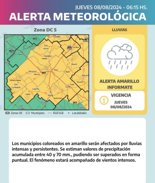 Desde el área d Defensa Civil Rauch se reportó esta mañana sobre las condiciones climáticas y el alerta amarillo por lluvias persistentes y tormentas, que afectarán toda la región. Se estima valores de precipitaciones de entre 40 y 70 milímetros. El fenómeno estará acompañado por fuertes vientos.